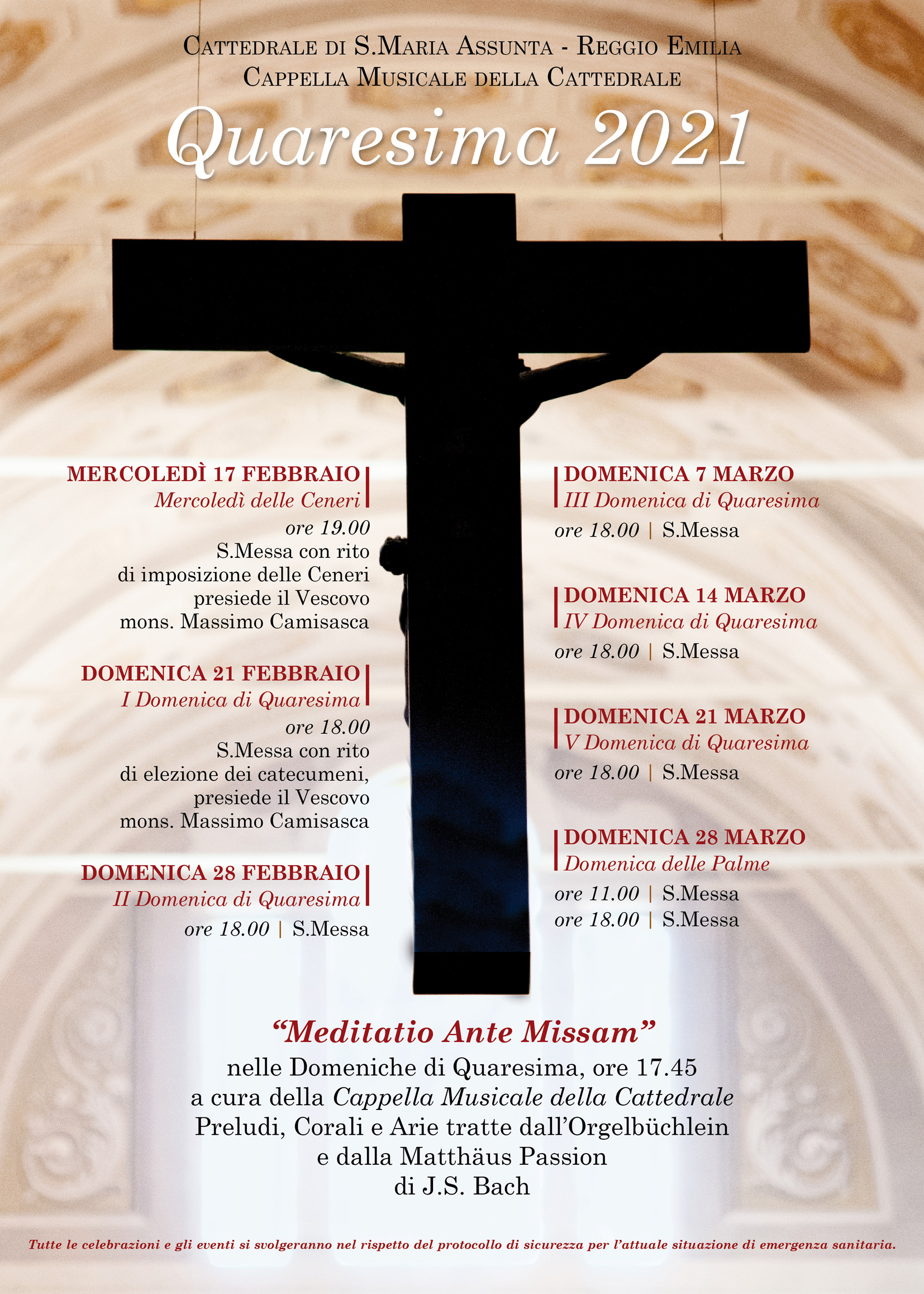 Il percorso musicale proposto si apre con il brano per organo “Wenn wir in höchsten Nöten sein” (quando siamo in gravi difficoltà). Già dalla I Domenica di Quaresima, ascoltando l’aria “Ich will dir mein Herze schenken” (io voglio donarti il mio cuore) si instaura una relazione in cui l’ascoltatore viene coinvolto in un dialogo personale nel quale l’ascolto si fa partecipazione e richiesta. Nella II Domenica l’ascolto ci fa approdare al Salmo 51 (cfr. Aria “Ist mein Herz”), la famosa richiesta di perdono del re Davide (il cui incipit dà il nome all’intero componimento poetico – miserere). La riuscita composizione di Pergolesi attirò l’attenzione di Bach, tanto da utilizzare questa musica per dar voce, con il canto, ad un testo che bene si addice al tempo quaresimale, tempo favorevole per la nostra conversione. Dalla Cantata in Re minore “Mein Gott, wie lang’, ach lange?” (Signore fino a quando?) BWV 155 ascoltiamo, nella III Domenica il duetto, “Du musst glauben, du musst hoffen”: un invito che ci viene rivolto affinché la nostra fede e speranza possano poggiarsi sulla consapevolezza che Cristo conosce fino in fondo il nostro camminare in tempi difficili. Tale invito alla speranza ci fa giungere poi alla Domenica detta “Laetare”, la IV di Quaresima, nella quale l’aria “Sanfte soll mein Todeskummer” (dall’Oratorio di Pasqua BWV 249 di Bach), facendoci immedesimare nel vissuto interiore dell’Apostolo Pietro, suggerisce al nostro cuore le parole fiduciose: “…le lacrime del mio dolore si asciugheranno dolcemente sulle mie gote”. Nella V Domenica di Quaresima l’aria del contralto “Erbarme dich, mein Gott” (Abbi pietà di me, mio Dio) conclude il cammino di ascolto in preparazione alla Pasqua, invocando il gesto che Dio compie, soprattutto all’inizio del Libro dell’Esodo (testo proposto come meditazione quasi continua dalla Liturgia delle Ore del tempo di Quaresima) descritto con le parole “ho osservato la miseria del mio popolo…ho udito il suo grido…sono sceso per liberarlo…” (cfr. Es 3,7-8). Meditando queste azioni di Dio siamo invitati, con l’ascolto di quest’aria tratta dalla Passione secondo Matteo, ad elevare la nostra invocazione: “guarda quaggiù”.